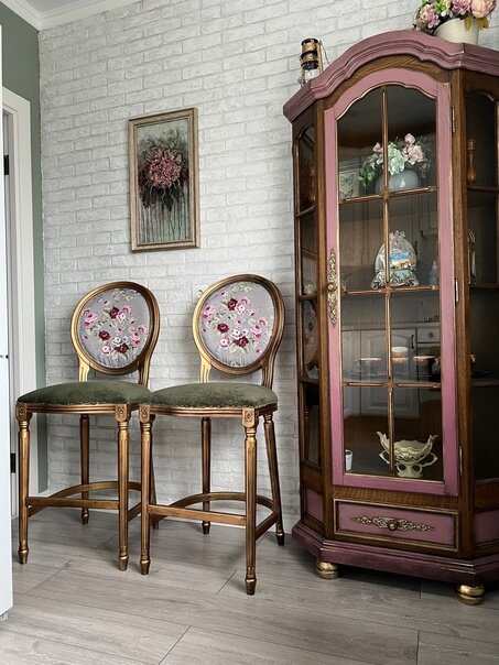 Обивка мебели весьма не простое дело, требуется много усилий. Немного я не доделала (как обычно), сгорел клеевой пистолет когда приклеивала тесьму.