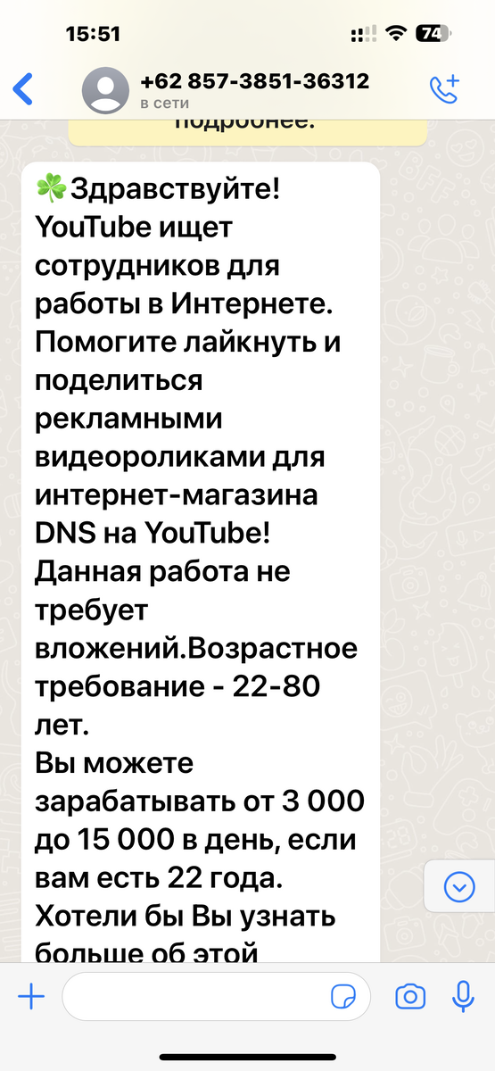 Так что если кто-то вам предлагают подобную "работу", то вы должны понимать, что это мошенники. Не отвечайте на сообщения, не переходите по ссылкам, блокируйте контакты и отправляйте в спам.