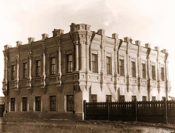В обиходе исследователей используются следующие документы: В 1901 г. каменный двухэтажный дом (!), деревянный флигель, конюшня, две завозни, амбар, погреб и баня причта Одигитриевской церкви были оценены в 5,0 тыс. руб. [ГААК. Ф. 63. Оп. 1. Д. 4. Л. 19-20]. В ведомости об имуществе церкви за 1905 г. значатся следующие здания: три каменные лавки в одном корпусе, построенные на церковной усадьбе, на деньги прихожан, и одна лавка с кладовой, построена в 1899 г. на церковные деньги. Кроме того, каменный двухэтажный дом с мезонином (!). В верхнем этаже помещалась церковно-приходская школа, а в нижнем - магазин, который сдавался в аренду. При доме находился хлебный амбар, который также сдавался в аренду. Школа была открыта в сентябре 1900 г. [ГААК. Ф. 26. Оп. 1. Д. 38. Л. 34-35].