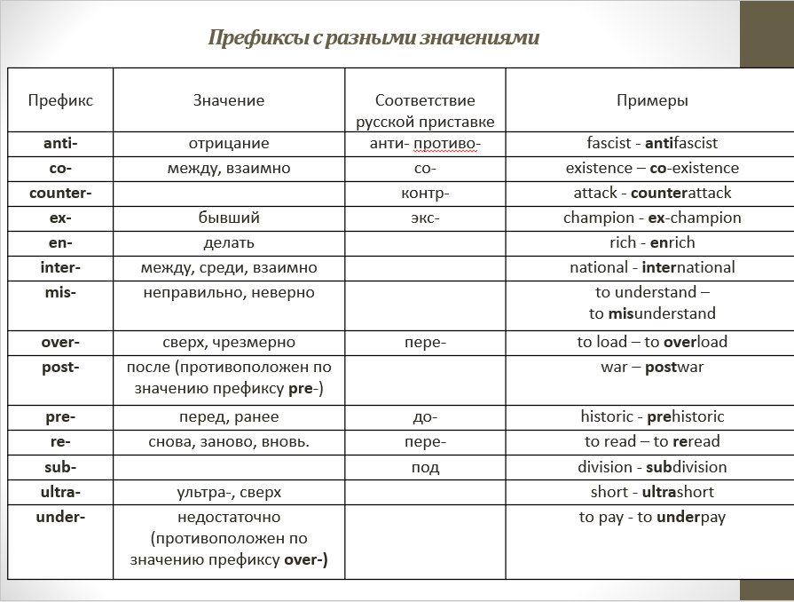 Аффиксы - это префиксы и суффиксы. Префиксы стоят в начале слова. Суффиксы – в конце слова Важно запомнить. Префиксы изменяют значение слова, но не меняют его принадлежности к той или иной части речи: •order (существительное) порядок - disorder (существительное) беспорядок. Важно запомнить. Суффиксы служат для образования одной части речи их другой: •beauty (существительное) красота – beautiful (прилагательное) красивый. Какие бывают префиксы: Какие бывают суффикы: -суффиксы существительных -суффиксы глаголов -суффиксы прилагательных -суффиксы наречий и числительных. То есть система строится следующим образом: Аффиксы Префексы и суффиксы Префексы в начале слова Суффиксы в конце слова Не меняют часть речи Меняют часть речи Меняют значение Не меняют значение Значение разное Суффиксы разных частей речи