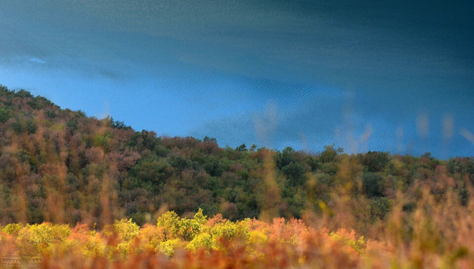 "Милый край, под синим небом чистым дивный рай" … — эти слова песни о Кавказе звучат у меня в голове, когда я вспоминаю горы. После феерического утра с туманом мы, закупившись некоторыми продуктами в селе, переместились к одному теперь широко известному месту – к Сулакскому каньону. Небесно-голубая вода разлилась, не сразу поймешь, что деревья на самом деле намного выше по склону. А еще на снимке как нельзя лучше мы можем наблюдать ярусность: тот лес, что ниже, даже не имеет намёка на осенний наряд, в то время как выше деревья уже надели золотое убранство.
