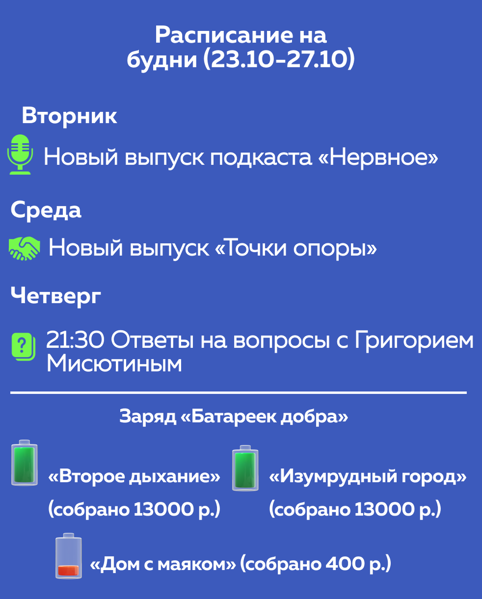 А вот что нас ждёт на следующей неделе! ✨ Во вторник выйдет новый выпуск подкаста «Нервное». ✨В среду порадуем вас мудрой и поддерживающей мыслью в «Точке опоры». ✨ В четверг Григорий ответит на ваши вопросы, присланные в @psycentergmbot. Спрашивайте о ваших трудностях, психотерапии, психологии, и Григорий обязательно вам ответит в эфире на ютубе 🙌 ✨В субботу в честь Хеллоуина днем смотрим и обсуждаем «Ведьмину службу доставки» с Ариной Губайдуллиной. А вечером играем в покер с Григорием Мисютиным! Стоимость билета на аниме-клуб для взрослых — 500р., а для подростков — 250р. Стоимость билета на покер — 600р. ✨ В воскресенье нас ждёт Английский клуб с Марией Осиповой. Будем кое-что смотреть, но что именно — не скажем, чтобы не было соблазна посмотреть заранее. Одно известно точно: будет круто! Стоимость билета — 500р. Ждем вас у нас в центре!