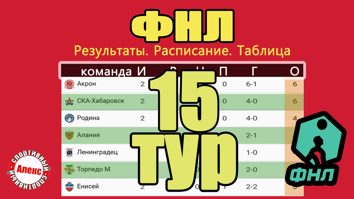 В футбольной национальной лиге завершился 15 тур. Лидер потерпел поражение. Рассказываю о результатах, расписании, бомбардирах, изменении в таблице. «Енисей» забил 5 мячей. Последний раз красноярцы выигрывали с подобным счетом 2,5 года назад в матче с «Шинником» (6-0). «Сокол» – 8 матчей идёт без поражений. «Химки» не уступают 7 игр подряд (5 побед и 2 ничьи). . . «Ленинградец» ни разу не победил в этом сезоне на своём поле – 3 ничьи и 4 поражения. «Акрон» побеждает в 4-й встрече, учитывая кубок России. . Расписание 16 тура. Алания – Арсенал, СКА – Ленинградец, Шинник – Торпедо, Сокол – Акрон, Енисей – КАМАЗ, Нефтехимик – Тюмень, Волгарь – Родина, Кубань – Черноморец, Химки – Динамо (Мх). Игры пройдут с 27 по 28 октября. . Бомбардиры. Окоронкво из «Арсенала» забил 9 голов. 5 игроков отдали по 4 паса. . Таблица. Алания – 28 очков. Динамо – 28. Акрон – 27. Тюмень – 26. Химки – 25. Первые 2 команды получат прямые путёвки в РПЛ. 3-я и 4-я сыграют в переходных матчах. В зоне риска – Черномо