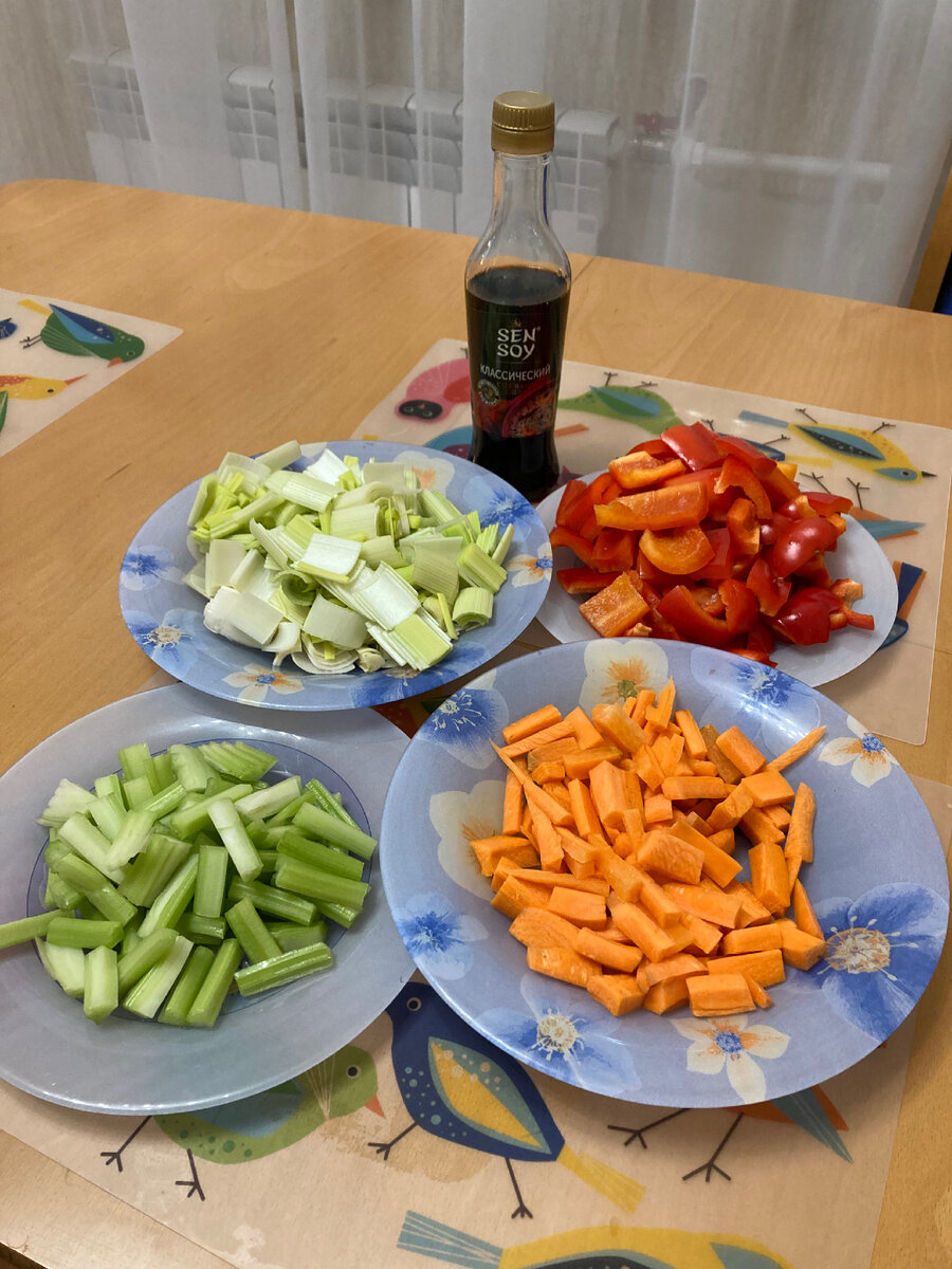 Приветствую, друзья-гурманы! Сегодня на нашем кулинарном канале у меня для вас необычный рецепт - простой и веселый гарнир из овощей, который станет вашим верным помощником на кухне. Волшебство этого блюда заключается в его простоте приготовления и взрывном сочетании вкусов. Пристегнитесь, мы отправляемся в радужный мир овощных смаколиков! Требуемые ингредиенты: - Стебель сельдерея (3 шт) - Лук-порей (1 шт) - Морковь (1 шт) - Перец болгарский (3 шт) - Оливковое масло - Соевый соус Шаг 1: Ритм веселья и танец на сковороде: - Давайте начнем с нарезки овощей на небольшую соломку. Взяли морковку? Точно! Теперь обжарьте ее на оливковом масле в раскаленной сковороде, аккуратно перемешивая, в танце веселья, в течение 2-3 минут. Пусть она подрумянится и выразительно выскажется вкусами. Шаг 2: Жарим сельдерей! - После погружаем в наш кулинарный танец стебли сельдерея, также нарезанные небольшой соломкой. Пусть он присоединится к морковке и продолжит свой танец на сковороде еще 2-3 минуты. Будем