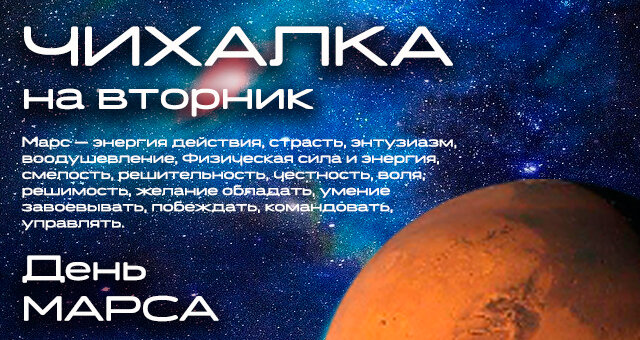 Марс наделяет человека физической силой и энергией, энтузиазмом и решительностью, даёт желание обладать и умение завоёвывать. Заведует умением командовать, управлять и побеждать. Награждает нас решительностью, волей и энергией действия. Ответствует за наши чувства — смелость, честность, страсть и воодушевление чем отчётливо влияет на наше подсознание. При использовании предсказаний — Чихалка на вторник, следует учитывать эти факторы, применительно ко всем дням недели.