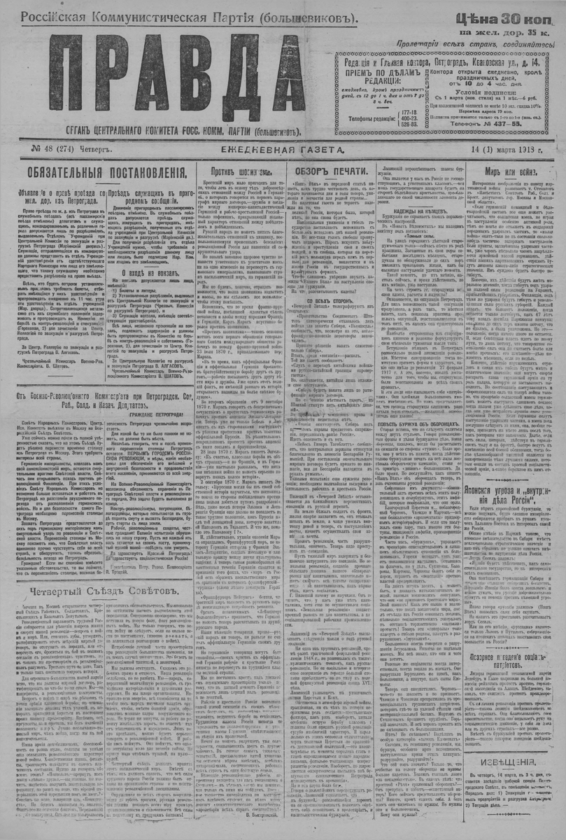 Статья здесь. Газета "Правда" № 48 (274) от 14 марта 1918 года. 4 страницы. Страница 1. Страница 2. Страница 3. Страница 4. Газета "Известия" № 54 (318) от 22 марта 1918 года. 4 страницы. Страница 1. Страница 2. Страница 3. Страница 4.