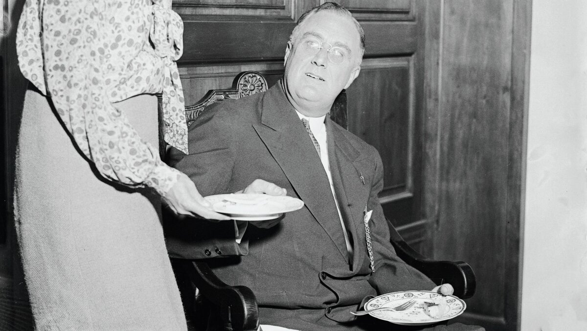 Сам Рузвельт всячески подыгрывал супруге, которая готовила ему в меру своих сил, но вряд ли был так уж счастлив ее инициативе. Он явно предпочел бы пить брют, закусывая лобстерами, но в итоге на публике ел блюда, наподобие вареных яиц с томатным соусом и картофельным пюре. Коронным блюдом Элеоноры был пудинг из чернослива. Почему именно из чернослива? Большая часть страны в лучшем случае могла позволить себе сухофрукты. Не стоило злить избирателей, по крайней мере, напоказ.
