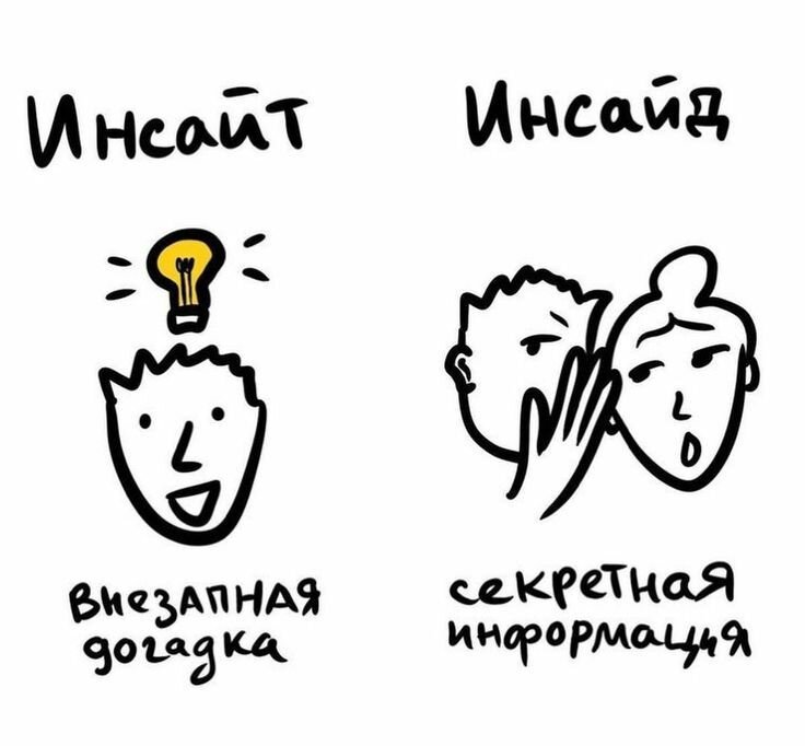 Слова, что звучат почти одинаково, но понятия разные - с английского insight и inside ! Разбираем: Инсайт (Insight) — это момент озарения, когда что-то поняли, все пазлы сложились и логическая цепочка выстроилась правильным, нужным образом. Иными словами иногда мы произносим: «Ааа я понял!» «Так вот оно как!» «Эврика!» Инсайд (inside — внутри) — это данные, информация, полученные, к примеру, от сотрудника какой-то фирмы, организации, и предназначенные для «ВНУТРЕННЕГО пользования». Как правило не подлежит разглашению. Пример: Собеседник из ООО «Ешки-матрешки»сообщил нашему корреспонденту несколько важных инсайдов. Пресс-секретарь компании в интервью поделился инсайдами касательно планов развития на международном рынке. Инсайдер - внутренний источник - человек внутри тусовки, компании, организации…