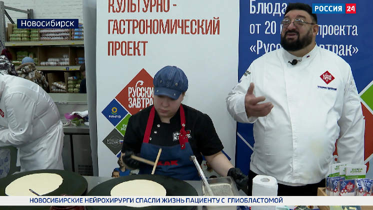 Терпкая брусника, кедровые орехи и немного сгущенного молока ─ этот рецепт придумали на охоте, рассказывает Владимир Бурковский. Нечасто известный шеф-повар дает открытые мастер-классы. Он ─ участник проекта «Русский завтрак», представляет город Новосибирск. В ходе проекта 20 поваров и отельеров разработали 80 рецептов с региональной изюминкой и презентуют их публике. Инициатором проекта «Русский завтрак» выступила компания «ЭкоНива» совместно с мультиформатной сетью «Лента» и федеральным проектом «Гастрономическая карта России». «Мы начинаем понимать, что в пищу надо употреблять местные продукты. А так как "ЭкоНива" имеет свою ферму на новосибирской земле, то грех было бы этим не воспользоваться», ─ говорит бренд-шеф, владелец гастрономического театра Puppen Haus Владимир Бурковский. И гости шанс не упускают. На дегустации пробуют творог, йогурты, сыры и русский завтрак по-сибирски. Рецепт простой, объясняет шеф, и раскрывает гостям мастер-класса секреты идеальных блинов. Для тех, кто