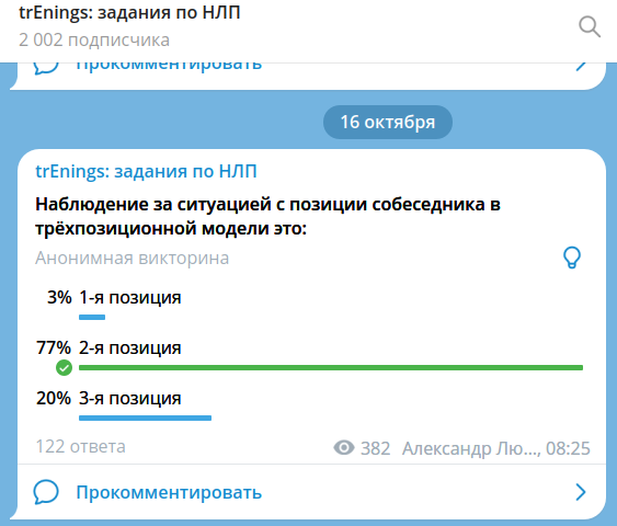 Количество подписчиков телеграм-канала "Задания по НЛП" достигло 2000 человек. И вы присоединяйтесь.