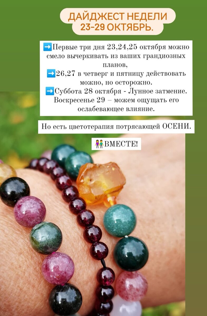 Плавно скользим по неделе с 23 по 29 октября и коридору затмений. 🌞🌑 Тема затмений никак не относится к советам Синхровидения, но я их учитываю, ведь встречаются люди, на которых они влияют. А, значит, при взаимодействии ними вы можете почувствовать на себе их неустойчивое настроение и некоторую напряженность. ➡️Первые три дня 23,24,25 октября можно смело вычеркивать из ваших грандиозных планов, ➡️26,27 в четверг и пятницу действовать можно, но осторожно. ➡️Суббота 28 октября - Лунное затмение. Воскресенье 29 – можем ощущать его ослабевающее влияние. Но есть цветотерапия потрясающей ОСЕНИ и предзимье. 👫ВМЕСТЕ!