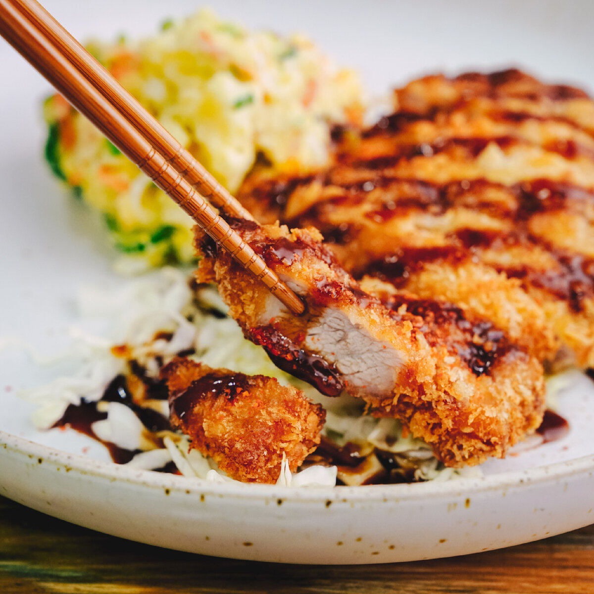 Краткое пояснение о блюде. Tonkatsu произносится; "свиная котлета" - японское блюдо, состоящее из панированной, обжаренной во фритюре свиной котлеты. Он включает в себя обмазывание ломтиков свинины панко (панировочными сухарями), а затем обжаривание их в масле. Два основных вида - филе и корейка. Тонкацу также является основой других блюд, таких как кацукаре и кацудон. Что обозначает. Слово тонкацу представляет собой комбинацию китайско-японского слова ton, означающего "свинья", и katsu, являющегося сокращенной формой katsuretsu старой транслитерации английского слова "котлета", которое, в свою очередь, было заимствовано из французского слова côtelette. История появления. Тонкацу возник в Японии в эпоху Мэйдзи в конце 19 века, как блюдо, производное от французского блюда, известного как котлет де во, телячьей котлеты, обмазанной панировочными сухарями и обжаренной на сковороде с маслом. Способ приготовления и подача. Можно использовать либо отрубленное свиное филе, либо свиную к