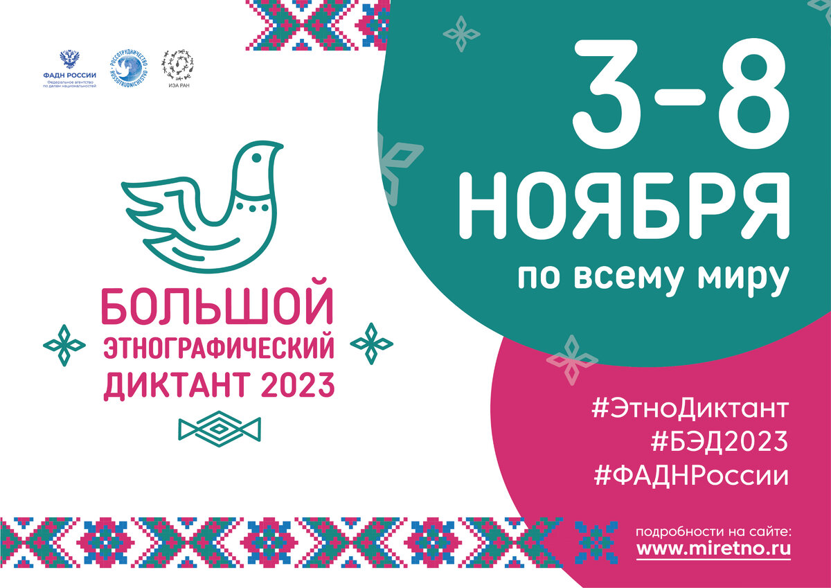 С 3 по 8 ноября 2023 года пройдет ежегодная Международная просветительская акция «Большой этнографический диктант», которая знакомит с культурой народов, проживающих в России, а также позволяет оценить общий уровень этнокультурной грамотности. Ежегодно жители Хакасии активно присоединяются к акции. Диктант проводится в канун Дня народного единства в онлайн- и офлайн-форматах. Организатором Большого этнографического диктанта является Федеральное агентство по делам национальностей, в Хакасии — Министерство национальной и территориальной политики РХ. Участниками акции ежегодно становятся миллионы жителей России и зарубежных стран независимо от возраста, образования, вероисповедания и гражданства. Диктант впервые прошел в 2016 году, тогда участие в нем приняли