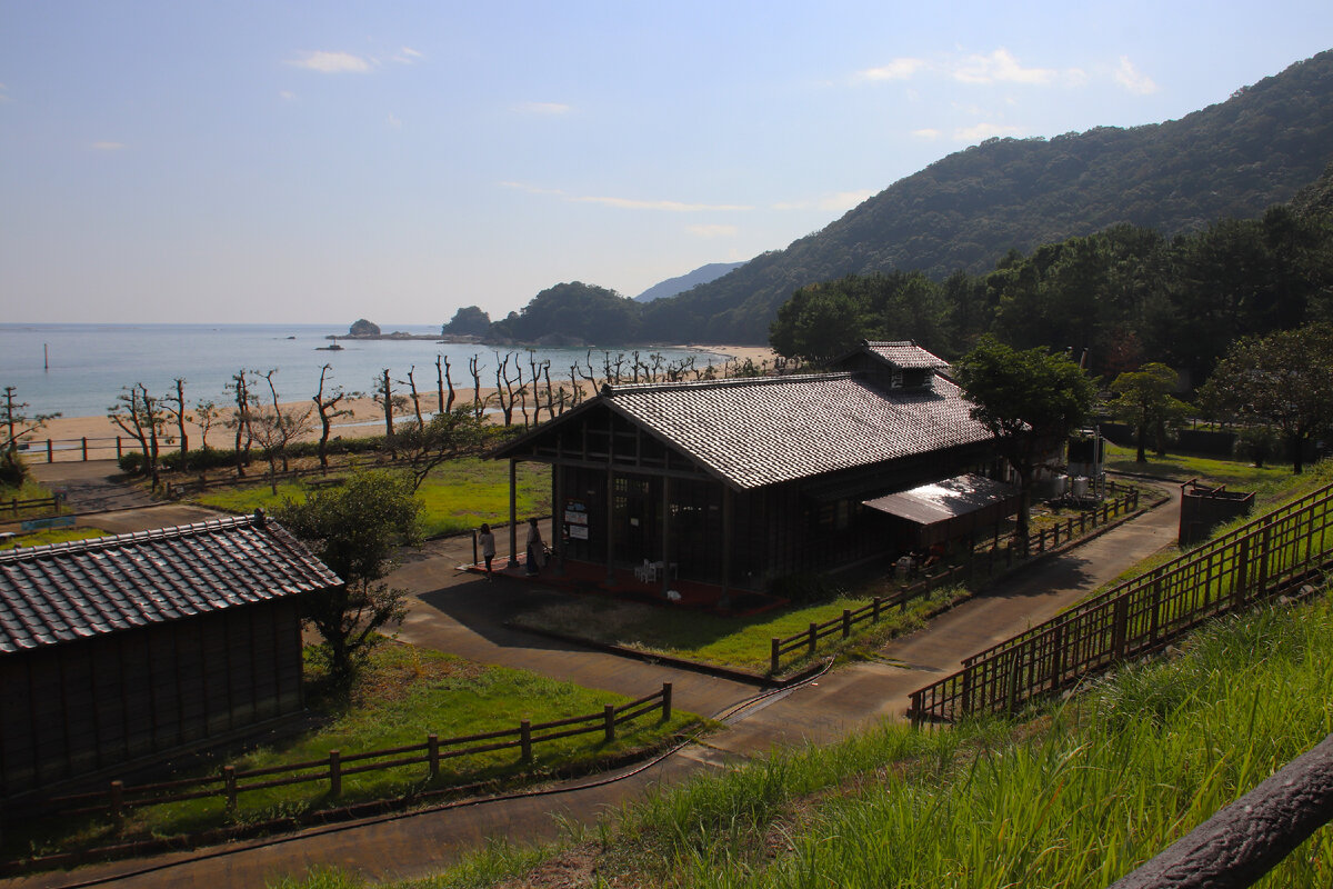Если спуститься по лестнице от придорожной станции в сторону побережья - можно увидеть прекрасный пляж Shimoaso, а на нем - два старых деревянных дома - это музей соли и солеварня.