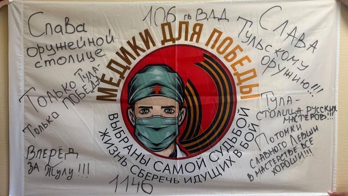 Флаг города Тулы и флаг благотворительного проекта «Медики для Победы», а также рисунок, посвященный бойцам спецоперации, были привезены из военного госпиталя в Луганске.