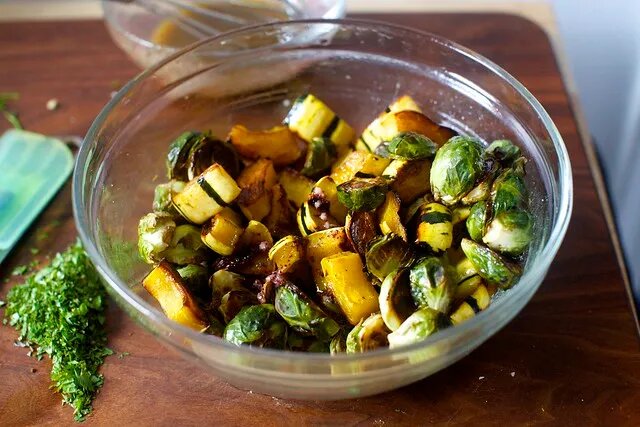 После дачного сезона у многих остались тыквы, а идей, что приготовить нет, поэтому мы предлагаем попробовать наш рецепт. Наслаждение будет не хуже, чем от привычных вам салатов с мясом. Ингредиенты: Приготовление: 1. Разогрейте духовку до 200 градусов. Смажьте два противня примерно одной ложкой оливкового масла. Отрежьте кончики тыквы и соскоблите семена ложкой. Нарежьте тыкву кольцами (примерно по 1,5 см), затем разрежьте каждое кольцо на 6 частей. Выкладываем на первый противень в один слой, посыпаем солью и перцем. Запекаем 20-25 минут, пока нижняя часть не подрумянится, затем переверните и запекайте еще 10-15 минут, пока не подрумянится и не станет мягким в центре. Уберите в сторону, чтобы немного остыло. 2. Обрежьте концы и обесцвеченные листья брюссельской капусты и разрежьте их пополам. Разложите срезом в низ на второй противень, посолите и поперчите. Запекайте 15 минут, после чего переверните и запекайте еще 5-10 минут, пока он не начнут подрумяниваться. Уберите в сторону, ч