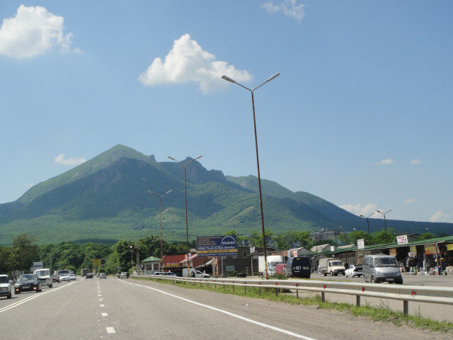 "Глухонемой" из зала махал руками и кричал в ответ, но качественная пластиковая рама не позволяла услышать его с улицы. Между тем на ленте появился багаж, я быстро схватил чемоданы и направился к выходу из вокзала. У выхода скопились жаждавшие халявного заработка таксисты. Но мы были не склонны поощрять частный извоз, ибо отель, в котором нам забронировали номера, предоставлял и трансфер. Заметив одиноко стоявшего человека с табличкой, мы направились к нему, оставив таксистов дожидаться менее предусмотрительных пассажиров. Таксист оказался пожилым, весьма словоохотливым дядькой. Дорогой он рассказал нам, о некоторых особенностях местных минеральных вод, дал краткое описание мест, которые следует посетить, ответил на некоторые волнующие нас вопросы. Дорогой из аэропорта наслаждались местными видами. Природа КавМинВод зачаровывает совим великолепием. На первой фотке гора Бештау.