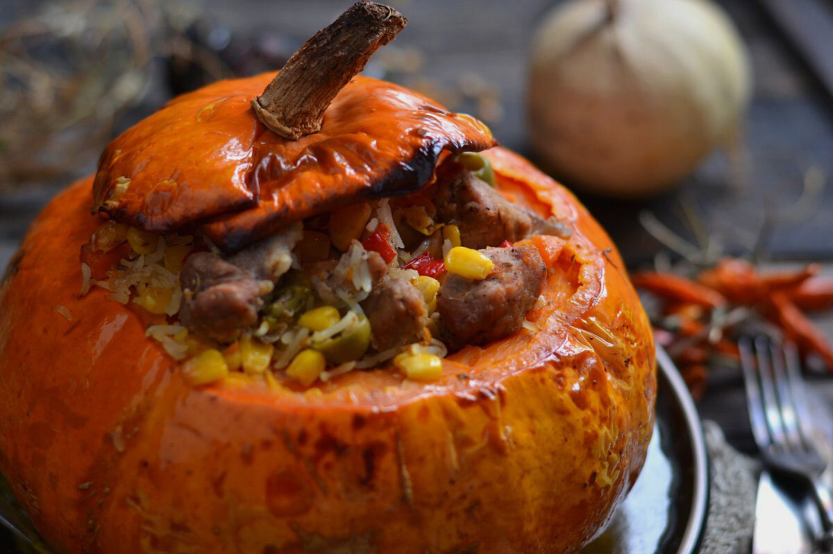 3. В форму для запекания выложить обжаренное мясо, сверху равномерно распределить тыкву и картофель. Затем выложить слой лука.
