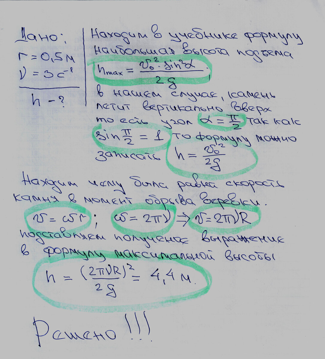 Задача: К верёвке длиной 0,5 м привязан камень. При вращении камня в вертикальной плоскости верёвка обрывается в тот момент, когда скорость камня была направлена вертикально вверх. На какую высоту поднимется камень, если его вращали со скоростью 3с^-1( в степени -1). Решение: Для начала небольшая поправка. В условиях задачи сказано, что камень вращали со скоростью 3с^-1( в степени -1). Но это частота вращения, из чего я исходил при решении задачи. Далее берём формулу из учебника, наибольшая высота подъёма. За тем зная частоту вращения и радиус находим скорость камня в момент обрыва верёвки Vo. Подставляем данные, получаем ответ.