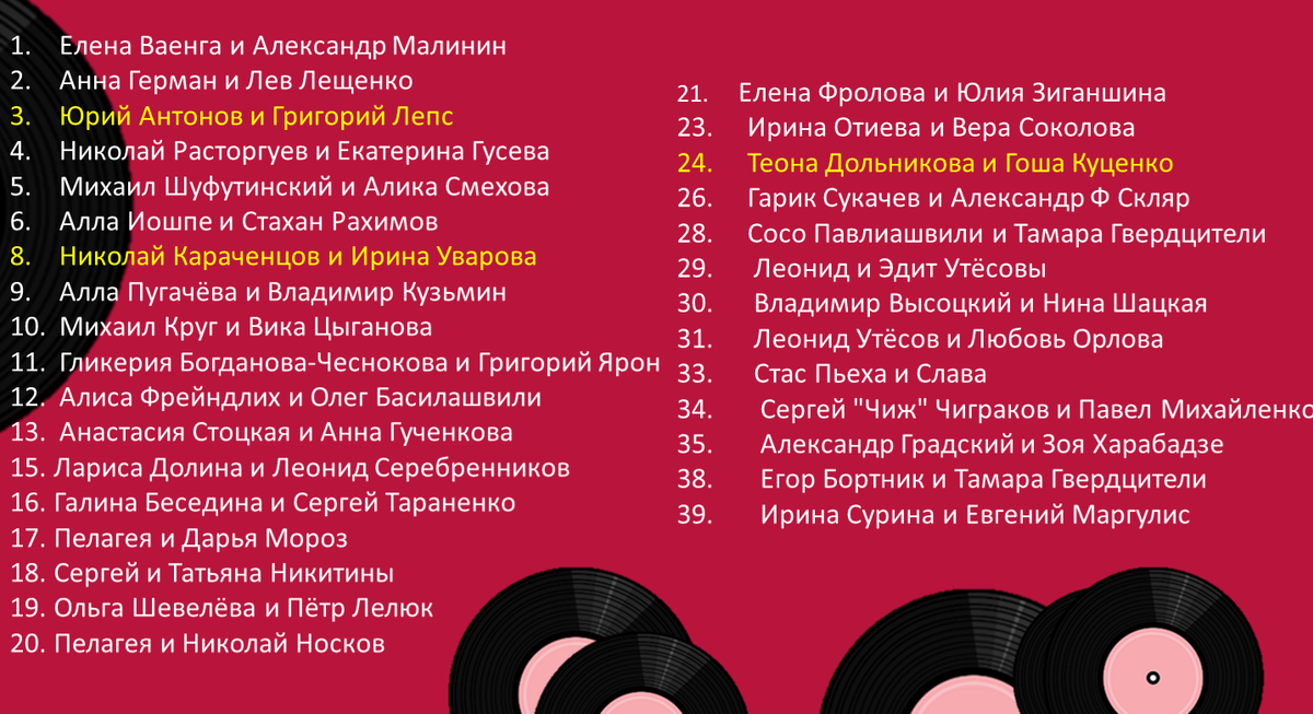 Здравствуйте! А мы рассказываем о любимых отечественных дуэтах. Не обо всех сразу, а о нескольких, которых выбираем в ходе голосования.