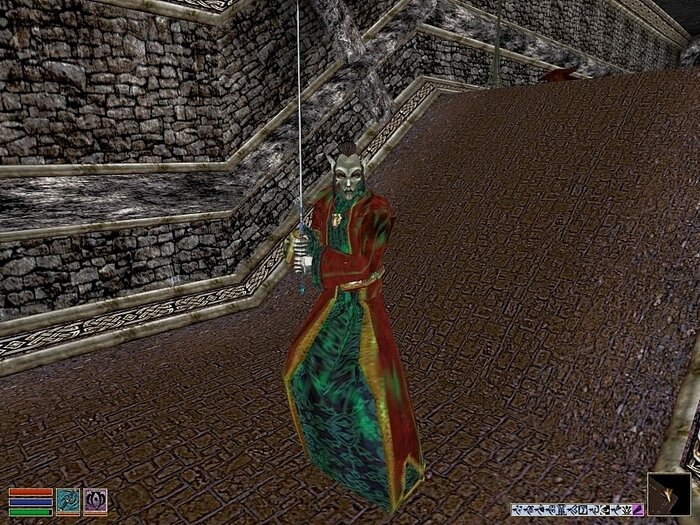 Зачищаем верхний ярус. Негоже врагов оставлять за спиной. Прыгни сейчас на арену, примутся ведь сверху стрелами да магией поливать. Впрочем, врагов не бессчетное количество. Это ж тебе не Дьябло, где мобы стопятисотого левела прут и прут эшелонами. Так, всякая данмерская сволочь, кто с хитиновым луком, кто с железным кинжалом. У Ираси Отран, коя взялась было суммонить, забираем невольничий ключ. На площадке лестницы, ведущей на нижний ярус, попадается какой-то колдун в красной мантии, разошедшийся не на шутку. То ходячий труп призовет, то удар холода с отравлением скастует. Потом длиннющей клейморой взмахнет и снова принимается чародеить. Да столько ж маны ты себе начитерил? А если мы тебя по-простому, с плеча? Ну вот, не помогла тебе твоя магия.