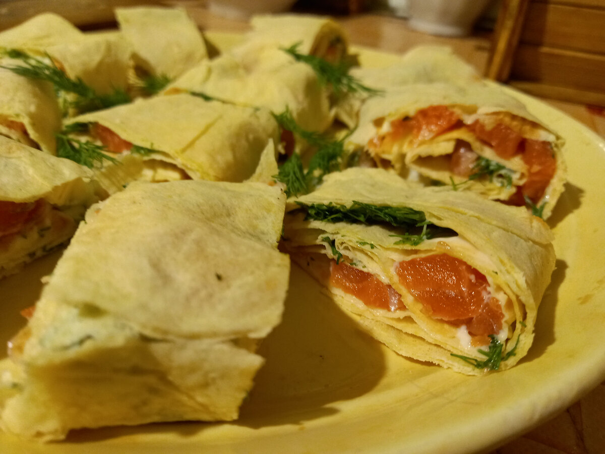 Смазываем лаваш плавленным сыром или твороженным сыром. Кладем на сыр нарезанный мелко укроп, а затем маленькими кусочками выкладываем красную рыбу. Закручиваем. Нарезаем на роллы.