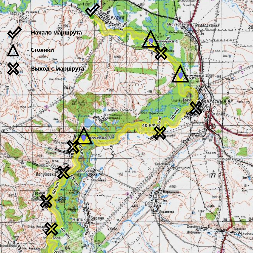 Сам маршрут не менялся, менялся лишь его график прохождения. В первые два дня из-за позднего выхода и обильного количества завалов было пройдено меньше чем заявлено , и в остальные дни пришлось наверстывать отставание