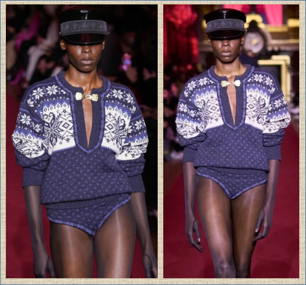 Смотрите какой встретила шик-блеск-тра-та-та! Представил ее еще в прошлом сезоне Dundas - это марка одежды норвежского дизайнера Питера Дундас. Впервые свои коллекции он представил в 2017 году, а до этого работал в модных домах Emilio Pucci и Roberto Cavalli. Не будем останавливаться на нижней части предмета гардероба, хотя в холодные норвежские зимы шерстяные трусы могут быть достаточно необходимым аксессуаром. Взглянем на жаккардовую кофту с глубоким вырезом, подхваченным металлической пряжкой, спущенными плечами и широкими рукавами. А перед тем, как продолжить рассказ, еще раз приглашу вас в свой новый телеграмм-канал, очень старательно собираю там свой материал по жаккарду. Уже очень много опубликовала и еще обещаю много-много всего самого интересного. Заходите. Всем очень рада, вот ссылочка: Ну и продолжу. Кстати говоря, заметили, что во многих моделях ведущих дизайнеров рукава свитеров не просто объемные сами по себе, но еще и длиннее положенного по размеру. Это позволяет создат