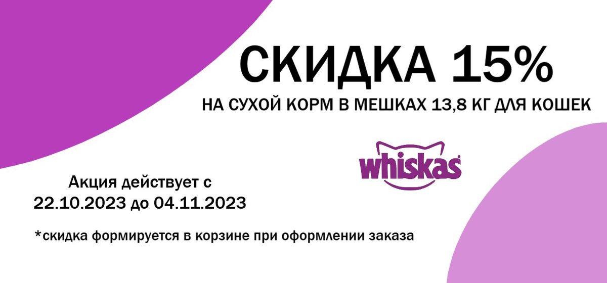 АКЦИЯ WHISKAS -15% СКИДКА НА СУХОЙ КОРМ ДЛЯ КОШЕК В МЕШКАХ 13,8КГ, ОКТЯБРЬ! АКЦИЯ ДЕЙСТВУЕТ С 22.10.2023 ПО 04.11.2023 Г.