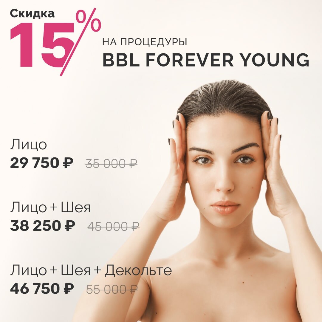 Мы рады предложить вам скидку 15 % на процедуры BBL Forever Young для лечения кожи и ее омоложения. Безболезненное аппаратное воздействие широкополосного света способно творить чудеса: · Исчезнет гиперпигментация · Ликвидируются прыщики и следы от них · Разгладятся мелкие морщины и сократятся глубокие · Кожа будет выглядеть сияющей и здоровой Огромное преимущество процедуры – в быстром эффекте (буквально на следующий день) и в накоплении положительных изменений при прохождении курсового лечения. Если вы хотите отлично выглядеть на важном для вас мероприятии, то достаточно одного сеанса, если ждете стойкого эффекта – то добро пожаловать на курс процедур (до 6). Процедуры можно проводить как для отдельных зон, так и в комплексе: · Лицо · Декольте · Шея · Лицо + Шея · Лицо + Шея + Декольте · Шея + Декольте · Кисти рук · Руки полностью При этом комплексные процедуры обходятся дешевле, чем по отдельности для каждой зоны. Спешите воспользоваться нашей 15-процентной скидкой! Ждем! #косметолог