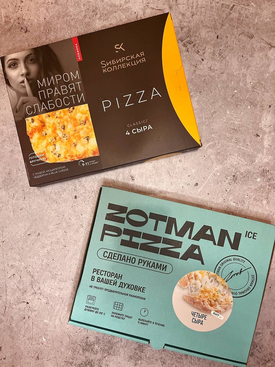 Если читаешь это - поставь лайк и подпишись! Дорогие друзья, наверняка вы уже видели наш обзор на самую вкусную пиццу из магазина, если же нет, то самое время посмотреть. Так вот, сегодня я нашёл для неё конкурента! Во всяком случае, так показалось на первый взгляд. Итак, сегодня на сравнении две пиццы - ZOTMAN 4 сыра и Сибирская коллекция 4 сыра. Если с первой мы уже знакомы, то вторая появилась на прилавках совсем недавно и всем своим видом заявляет о превосходстве. По составу обе пиццы практически идентичны (сыры используются одни и те же, разница лишь в количестве каждого вида). Я бы выложил фотографии составов, но тогда время прочтения всей статьи увеличится раз в 5 (из-за большого количества сыров общий состав тоже достаточно большой). По внешнему виду можно увидеть небольшие отличия, но в целом, достаточно похожи. Итак, начнём по порядку. ZOTMAN пицца 4 сыра. Цена в Ленте - 526 рублей (379 по карте Ленты). У пиццы тонкое и хрустящее тесто. Даже корочки