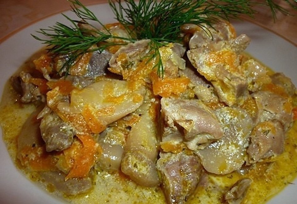 Понадобится: 650гр. куриных желудков., 400гр. картофеля., 300гр. любых свежих грибов., 50гр. сметаны., 1 яйцо., лавровый лист., соль., перец. Крупно нарезать грибы, картофель нарезать кубиками по 2см. Промыть желудочки, удалить желчные плёнки, снова промыть, разрезать, если большие, на 2-3 части, залить водой, положить лавровый лист и проварить 2 часа до мягкости. Добавить к готовым желудком грибы, подсолить, довести до кипения, убавить огонь и 15 минут проварить, положить картофель и варить до его готовности. Сметану перемешать с яйцом, залить смесь в кастрюлю, перемешать, убрать её с плиты. Приятного аппетита!
