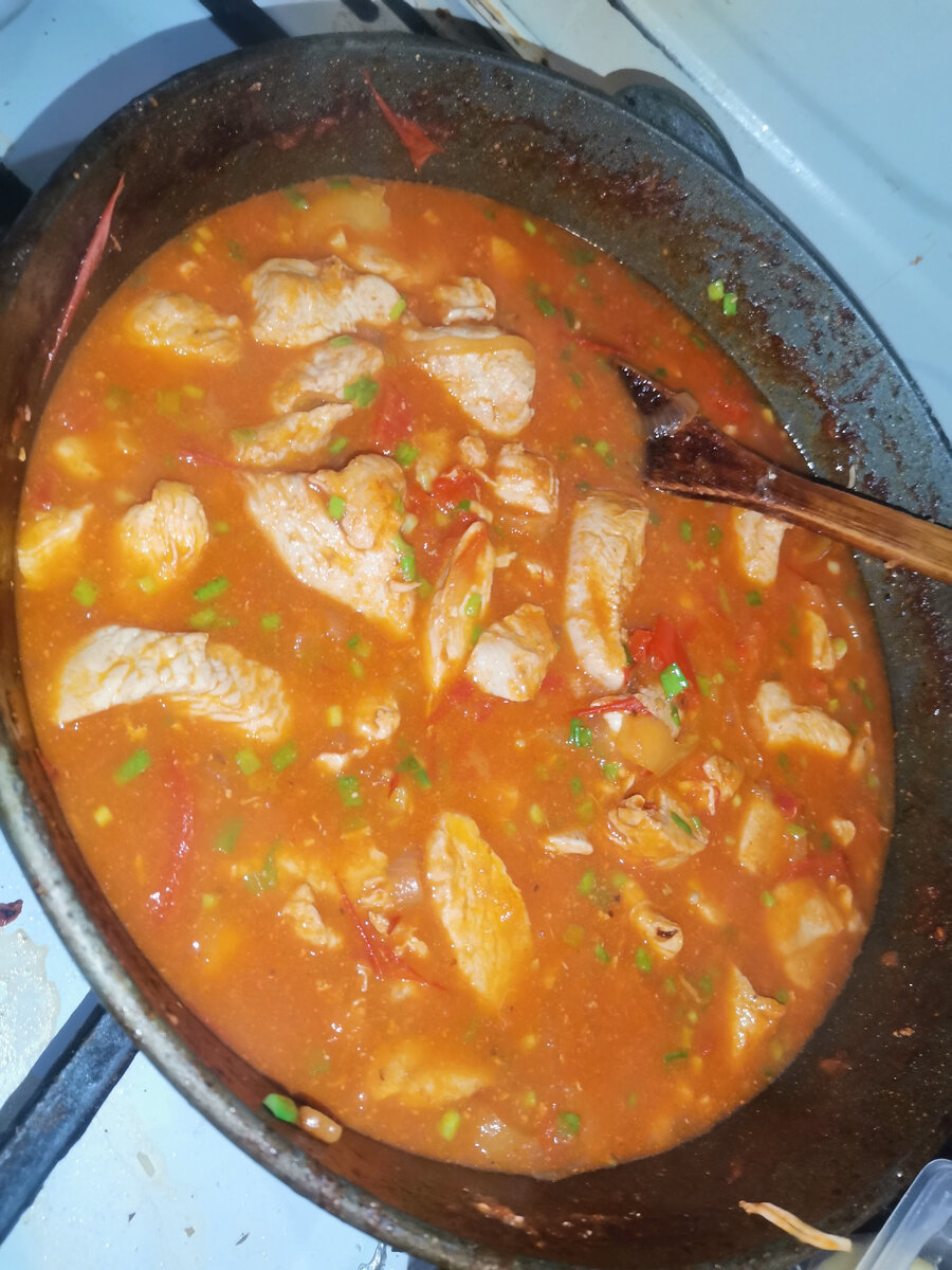 Ингредиенты : Шаг 1 Наризаем индейку, полосками примерно как на фото. Шаг 2 И обжариваем Шаг 3 Очищаем и нарезаем лук полу кольцами. Добавляем к индейке. Шаг 4 Наризаем болгарский перец и добавляем к индейке. Шаг 5 Наризаем помидоры, как вы смогли догадаться, полосками Шаг 6 Всё перемешиваем и добавляем соль и перец Шаг 7 Добавляем томатную пасту и оставшиеся специи Шаг 8 Перемешиваем и добавляем сахар Шаг 9 Наризаем зелёный лук и зелень Шаг 10 Всё готово, приятного аппетита ❤️ На гарнир можно использовать крупы, макароны или пюре 🤗 Пояснение :