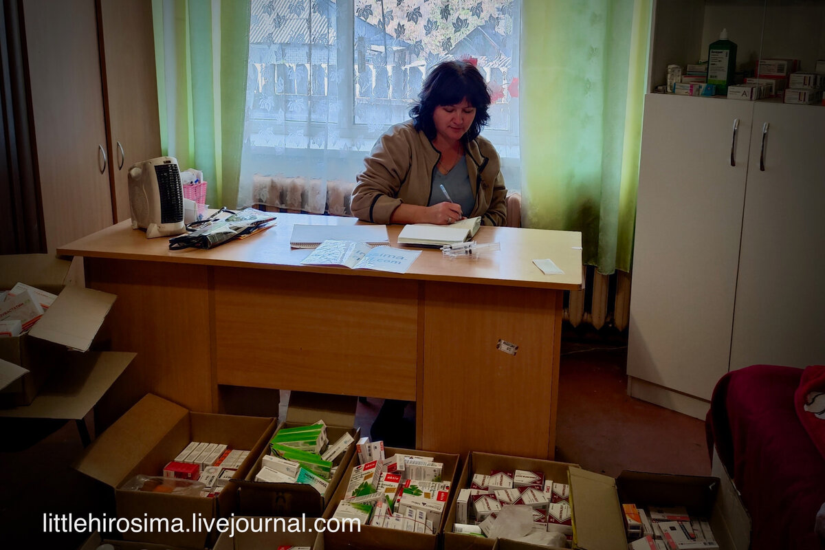 Так вот, там находится маленький медпункт, который организовали в одном из домов. Писала про него много раз - мы им регулярно привозим лекарства для жителей с прошлой весны. Там "работают" совершенно потрясающие женщины, фельдшеры. Ангелы-хранители местных. Почти каждый раз, как мы туда привозили помощь, там прямо на месте кто-то находился на прокапывании, еще на каких-либо процедурах. Все оборудовано фактически в одной комнате. Лекарства кладутся в шкаф, где когда-то стояла посуда, люди лежат на диванах, где когда-то смотрели телевизор.