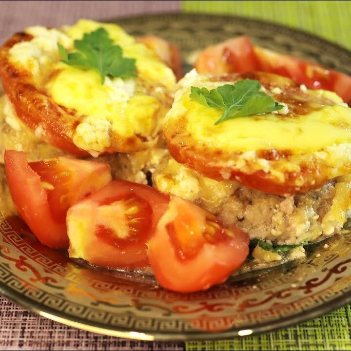 - на каждую котлетку положить по кружочку лука и по кружку помидора;