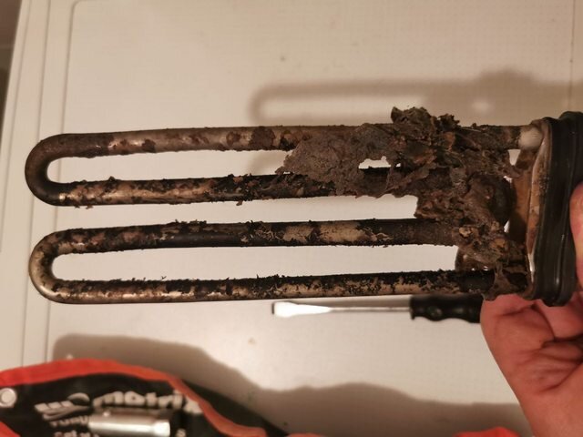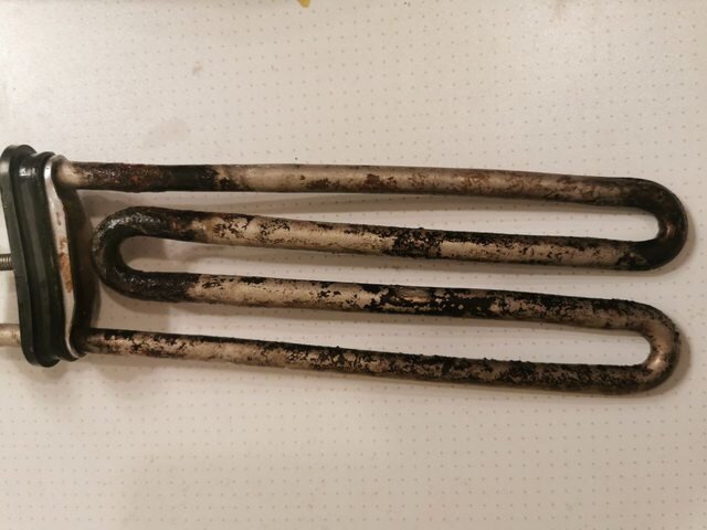 В Siemens IQ500 доступ к ТЭНу получить легко, сняв заднюю крышку (в отличии от IQ300, у которой ТЭН впереди стиральной машины,так что приходится повозиться, чтобы снять переднюю панель). Можно было бы измерить сопротивление, но у меня только старый советский Ц20, для которого нужно было бы колхозить питание. Да и после 13 лет работы было ожидаемо, что ТЭН придёт в негодность. Хотя у некоторых нагревательный элемент служить всего несколько лет. В моём случае на ТЭНе были видны чёрные пятна, плюс он собрал много мусора, но вот трубки при этом не поломались (хотя нередко бывает и такое).