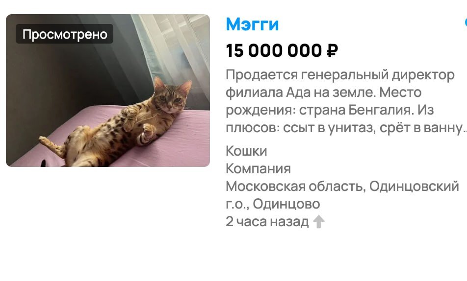 «Думаю, это оптимальная цена». В Подмосковье за 15 млн рублей продают «генерального директора филиала ада на земле». Кошка по кличке Мэгги приучена к лотку унитазу и ванне, правда, копает «пока метро не выроет или нефть не найдёт». Хозяин Мэгги Сергей признался «Подъёму», что готов скинуть 500 рублей, которые новый владелец, скорее всего, потратит на туалетную бумагу. К ней у кошки особая страсть. «15 миллионов – это не дорого. Рублей 500 могу скинуть, на пару упаковок туалетной бумаги Zewa – разматывает всё к чертям собачьим. Я ради прикола написал представителям Zewa. Говорю, можете сделать её амбассадором своей компании, но мне не ответили». Сергей признался, что поведение Мэгги скачет от состояния «лучшая кошка на земле» до «худшая» в течение 10 минут. Из плюсов: «ссыт в унитаз, cpёт в вaнну, единственное – сама нe cмываeт и говно cвоё не убиpaет». От желающих уже нет отбоя. «Я уже по работе не успеваю отвечать, потому что все звонят. Люди с юмором относятся к этому объявлен