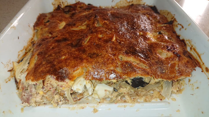 Для теста: ✓ Творог 9% - 4 ст. л. ✓ Яйцо куриное - 1 шт. ✓ Йогурт - 4 ст. л. ✓ Отруби овсяные - 2 ст. л. ✓ Соевая мука - 2 ст. л. ✓ Гороховая мука - 1 ст. л. ✓ Специи и соль - по вкусу. Начинка: ✓ Яйцо куриное отварное - 4 шт. ✓ Лук репчатый - 250 г ✓ Бекон - 100 г ✓ Грибы свежие/консервированные - 100 г ✓ Йогурт - 2 ст. л. И ещё яйцо 1 шт. (желток для смазывания верха пирога, белок добавила в тесто). Масса ~1100 г. КБЖУ на 100 г - 160/11/9.6/6.7. От наших друзей: Алексей Романов, лидер группы "Воскресение", на Радио Медиаметрикс Приготовление: Творог, яйцо, йогурт взбить погружным блендером в однородную массу. Добавить отруби, и пусть постоят минут 5-7 для набухания. Затем соль, специи, муку. Тесто получается, как густая сметана. Для начинки: Отварить яйца. Оставшиеся ингредиенты (лук, бекон, грибы) измельчить, добавить йогурт и тщательно перемешать. Всё, начинка готова Духовку разогреть до 190 градусов, режим верх/низ. Дно формы смазать растительным маслом, половину теста выложить т