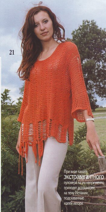 Перед: аналогично спинке, но для выреза горловины на высоте 45 см от начала оставить средние 10 п. и далее обе стороны закончить раздельно. Для закругления оставить в каждом ряду 2 раза по 3 п., 2 раза по 2 п. и 1 раз 1 п. На высоте 60 см от начала закончить работу. По низу переда выполнить кайму: между рельефными столбиками вместо ст. с/н вязать цепочки из 6 возд. п. Через 10 см вязать произвольно ассиметричные формы в направлении сверху вниз, оформляя таким образом “рваный край”. Для этого сначала вяжется цепочка из возд. петель произвольной длины, а затем на ней выполняются на собственный вкус либо ст. с/н, либо ст. б/н, либо “филейная сетка”.