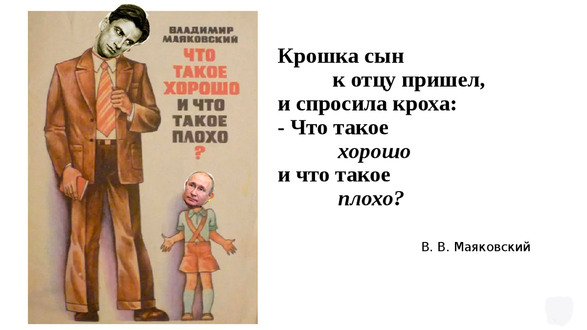 Трудные сейчас времена. И все, включая нашего уважаемого президента, задают хотя бы самому себе важные вопросы. А чтобы получить ПРАВИЛЬНЫЙ ответ - необходимо активизировать в себе субличность "Внутренний Ребенок" (по теории транзактного анализа). Именно он связан с нашим мудрым "Я", с ИНТУИЦИЕЙ. Достигается же это разными путями. Например, через "БИБЛИОТЕРАПИЮ", когда ты обращаешься к произведениям, которые когда-то тебя вдохновляли и преображали. И этот ментально-эмоциональный ресурс через ПСИХИКУ привносится в настоящее. В этой связи я ИНТУИТИВНО для В.В.Путина подобрала мощнейшее, не сказать, что только детское, произведение от поэта с маскулинными качествами. Скажу про себя, что очень люблю Маяковского. На вступительных экзаменах в медицинский ВУЗ я написала сочинение в стихах на тему, связанную с ним. И получила высший балл. ПОЭТому чем богата сама, тем делюсь с другими. И пусть пребудут от творческого предка-патриота Владимира Маяковского к Владимиру Путину полезные идеи и пове