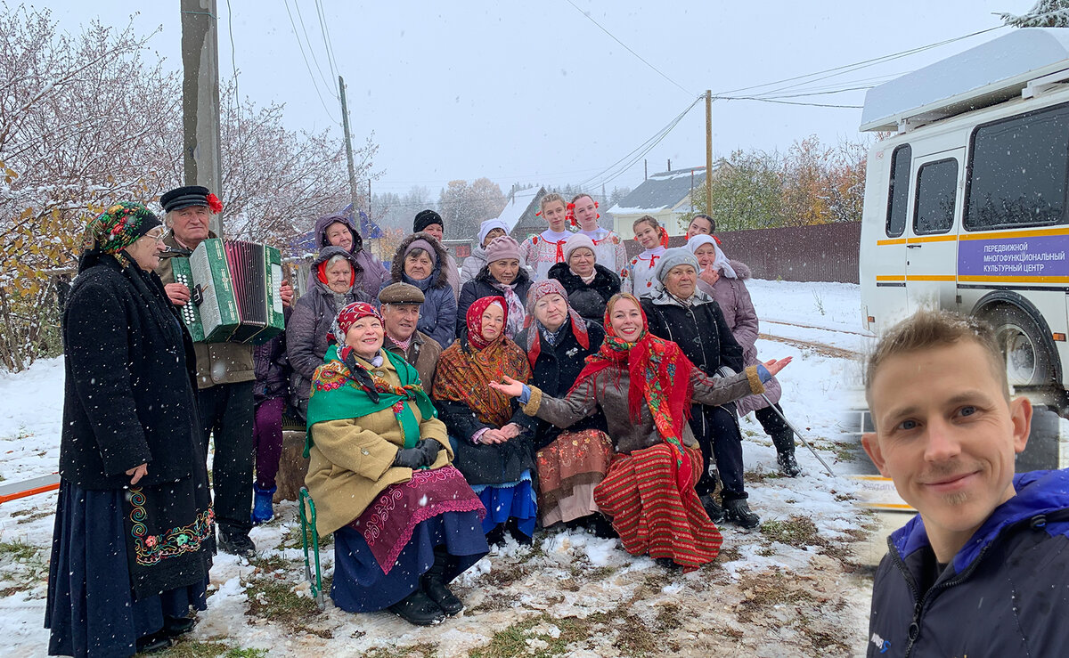 Сперва мы приехали в Ольховочку, а там не было света, электричества, то есть. Видимо из-за снега что-то нарушилось. Но концерт запланирован, а мы не привыкли отступать. Да в общем-то и сцены там не было, и мы свою передвижную не смогли бы установить в такую погоду. Зато у нас был гармонист, бабушки из фольклорного ансамбля и девчонки с танцами.