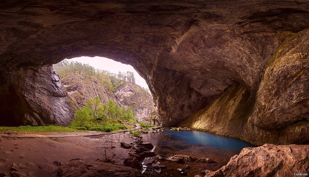- Капова пещера в Башкирии – одно из загадочных и уникальных мест. Расположена она в заповеднике "Шульган-Таш" на правом берегу реки Белой. Вход в пещеру представляет собой огромную арку высотой в 20 метров и шириной в 40 метров. Рядом находится Голубое озеро, которое, несмотря на свой небольшой размер, имеет глубину более 80 метров.