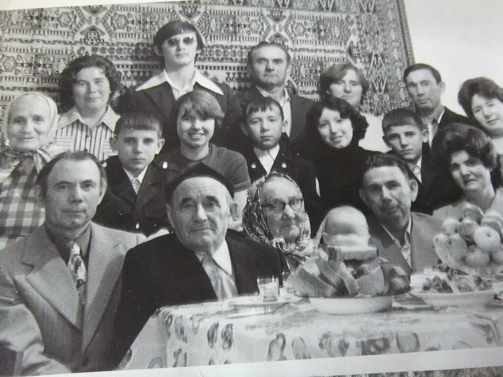 Все три сына со своими половинками, дочь с зятем, младшая сестра нашей бабушки и МЫ ВНУКИ… а на руках у бабушки самая младшенькая внучка. Вот такую малюсенькую они выходили до самой школы.
