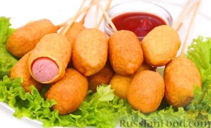 Готовим корн-доги дома. Это популярный американский фастфуд, который с легкостью можно приготовить в домашних условиях. Продукты: Сосиски - 350 г Яйцо - 1 шт. Мука пшеничная - 100 г Мука кукурузная - 100 г Разрыхлитель - 1/2 ч. л Молоко - 50-70 мл (смотрите по консистенции теста) Соль - 1/3 ч. л. Сахар - 1/2 ч. л. с горкой Масло растительное - для фритюра Пошаговый фото рецепт: Чтобы приготовить корн-доги нужно подготовить продукты. Для рецепта берите свои любимые вкусные сосиски. Если дома не нашли кукурузную муку, ее можно заменить пшеничной и сделать кляр только из пшеничной муки, будет тоже очень вкусно. Смешиваем сухие ингредиенты в емкости с высокими стенками, чтобы в дальнейшем было легко окунать сосиски. Добавляем яйцо, перемешиваем, вливаем молоко до получения очень густого теста. Сосиски предварительно обваливаем в муке. Прокалываем каждую сосиску шпажкой и окунаем в тесто полностью, чтобы верхняя часть шпажки тоже покрылась тестом. Разогреваем фритюр до 150-170 градусов, обж