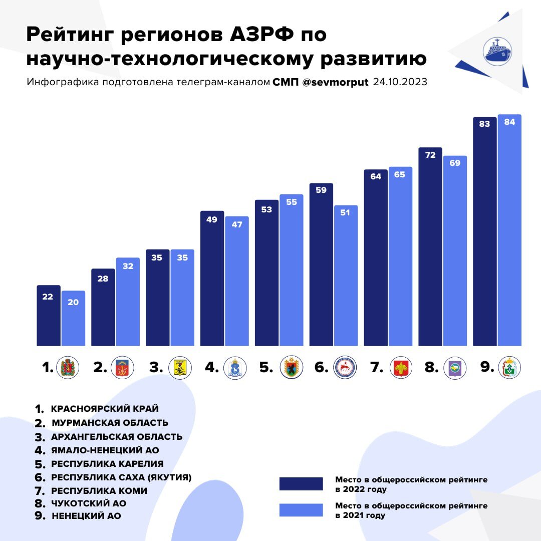 В середине списка находятся Карелия (53-е место), Ямал (49-е место) и Архангельская область (35-е место). Лидерами же в АЗРФ по научно-технологическому развитию в 2022 году стали Мурманская область (28-е место) и Красноярский край (22-е место). Учитывая мощную научно-производственную и образовательную базу последнего, это неудивительно.