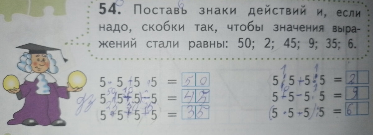 Поставь знаки действий и,если надо,скобки так,чтобы значения выражений стали равны: 50;2;45;9;35;6.