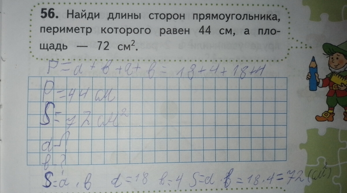Найди длины сторон прямоугольника,периметр которого равен 44 см,а площадь 72