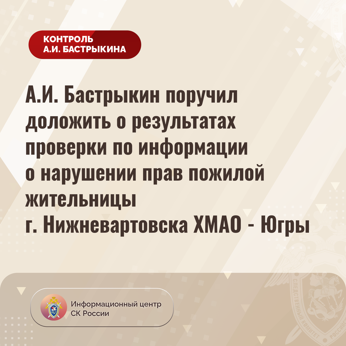 А.И. Бастрыкин поручил доложить о результатах проверки по информации о нарушении прав пожилой жительницы г. Нижневартовска ХМАО - Югры