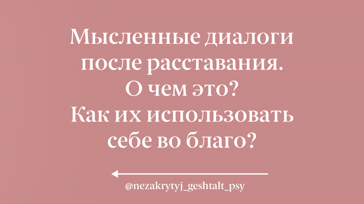 Достаточно много контента существует на тему "как избавиться от навязчивых диалогов и мыслей после расставания", а если пойти по другому пути - не избавляться, а смотреть в этот процесс со всей внимательностью... Ведь для чего-то он происходит? Что можно из него извлечь? Мысленные диалоги с кем-либо или "мысленные выяснения отношений" говорят о той самой "незавершенке", когда действительно есть какая-то собственная внутренняя потребность. Важное замечание: отношения с Другими есть смысл выяснять в прямом контакте, привнося туда свои переживания, заявляя о своих потребностях. Все, что остается на уровне "поговорить с Другим внутри своей головы" характеризует скорее какой-то внутренний процесс, и к Другим он не имеет никакого отношения (даже если внутренняя динамика разворачивается неким "ролевым разыгрыванием" с использованием образа Другого). Что позволяет прекращать внутренние диалоги? Понимание, чего хочется от Другого для себя по-честному (даже если это "хочется" невозможно реали