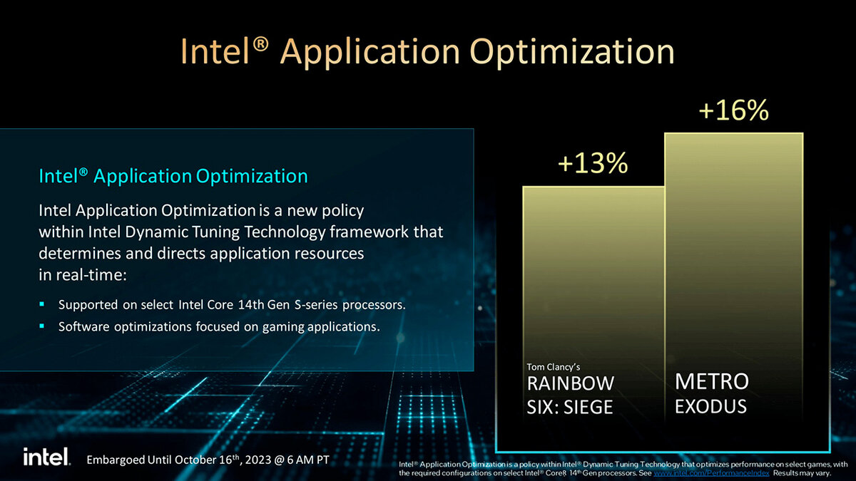Одной из особенностей новых процессоров Core 14-го поколения компания Intel называет Application Optimization. Эта функция грамотнее распределяет нагрузку на энергоэффективные и высокопроизводительные ядра. Сравнительно с механизмом Thread Director, появившимся с релизом первых процессоров Intel с разнородными ядрами, обеспечивает не просто неплохую, а впечатляющую прибавку быстродействия. Application Optimization обязательно требует специального профиля производительности. На данный момент он имеется только для 2 игр: Metro Exodus и Rainbow Six: Siege, где Intel обещает прибавку на 16% и 13% соответственно. Первые реальные тесты показали, что Intel даже скромничает. При активации этой функции в Metro Exodus кадровая частота увеличилась с 273 до 339 fps – на 24%. В Rainbow Six: Siege результаты ещё лучше: 659 против 867 fps (+31%). Тесты проводились во встроенном бенчмарке при разрешении 1080p. Intel заявляет, что Application Optimization может работать не только в играх, но в них прир